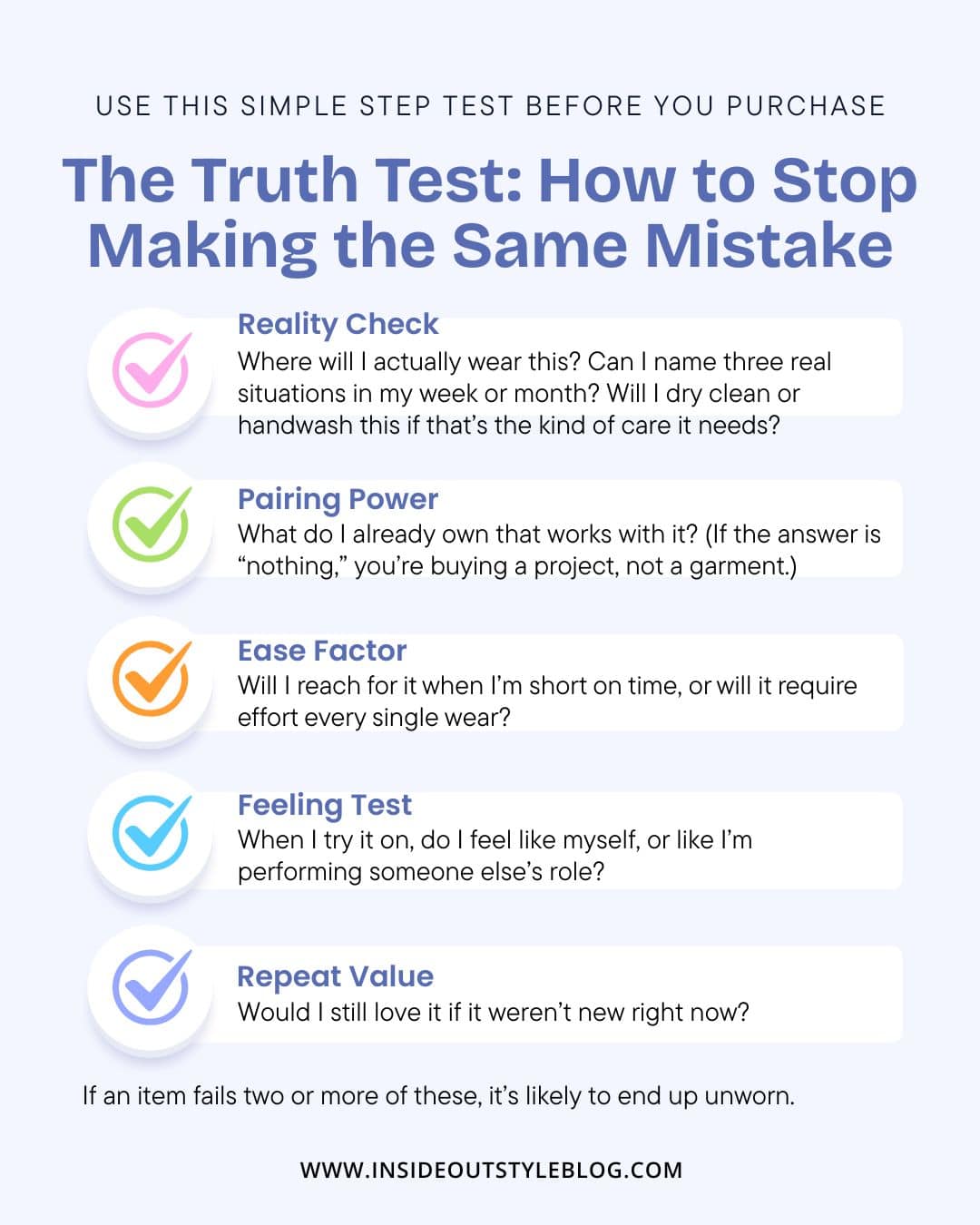 If an item fails two or more of these, it’s likely to end up unworn.